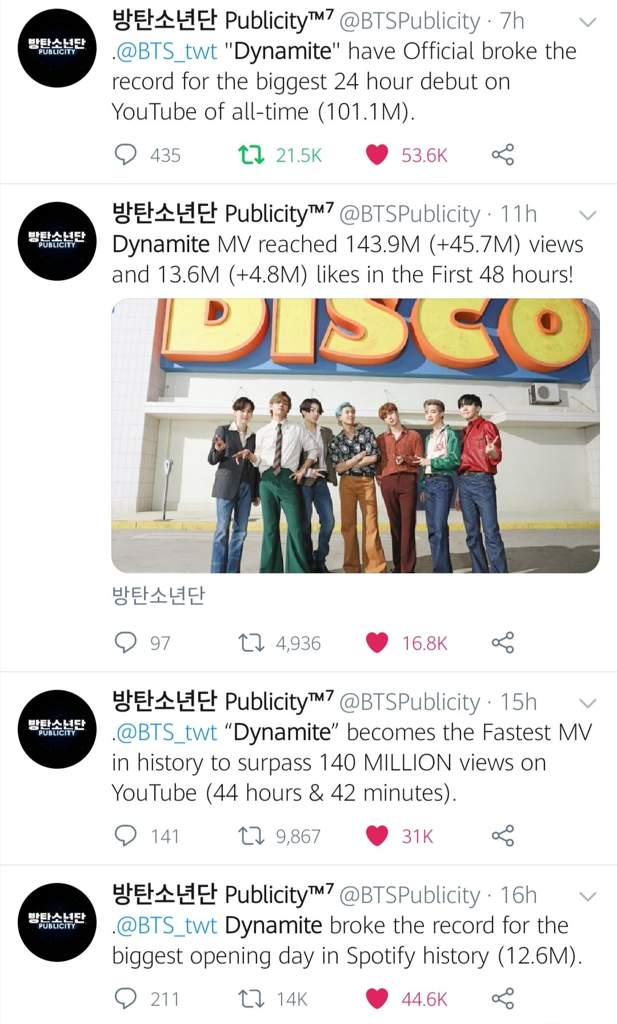 We can confirm that BTS 방탄소년단 Dynamite Official MV set a new all-time 24hr record surpassing 100M views with 1011m views in the first 24 hours. On August 21 BTS released Dynamite as their first English-language single and the MV for the song is stacking up views upon views. On August 19 at midnight KST BTS unveiled the MV teaser for.
